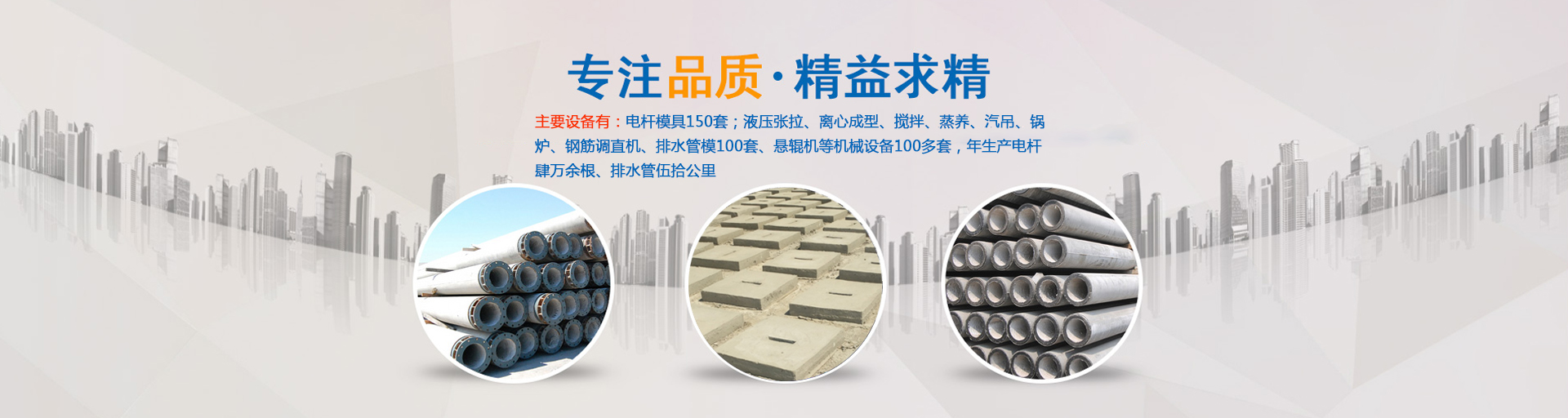 公司主要生產ф100—ф430環形預應力混凝土電桿和ф190—ф550環形鋼筋混凝土電桿,以及ф300—ф1000排水管,主要設備有:電桿模具180套;液壓張拉、離心成型、攪拌、蒸養、汽吊、鍋爐、鋼筋調直機、滾焊機、排水管模100套、懸輥機等機械設備100多套,年生產電桿肆萬余根、排水管伍拾公里?!?